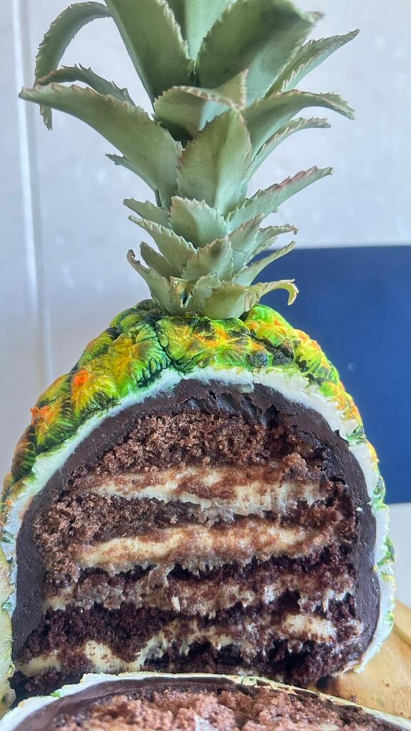 Um dos trabalhos que garantiu sua classificação é um bolo em formato perfeito de abacaxi, que impressiona pelo realismo. A obra reproduz com fidelidade a textura, as cores e até as nuances naturais da fruta, chamando a atenção dos jurados pela perfeição estética e acabamento minucioso.